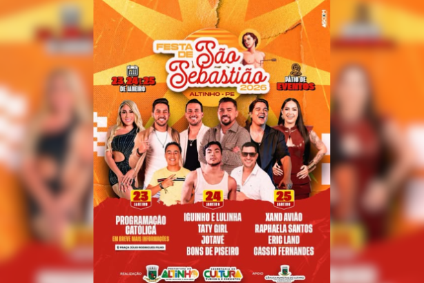 FESTA DE SÃO SEBASTIÃO EM ALTINHO CONTA COM SHOWS DE XAND AVIÃO E MAIS A festa acontece entre os dias 23 e 25 de janeiro, no Pátio de Eventos da…