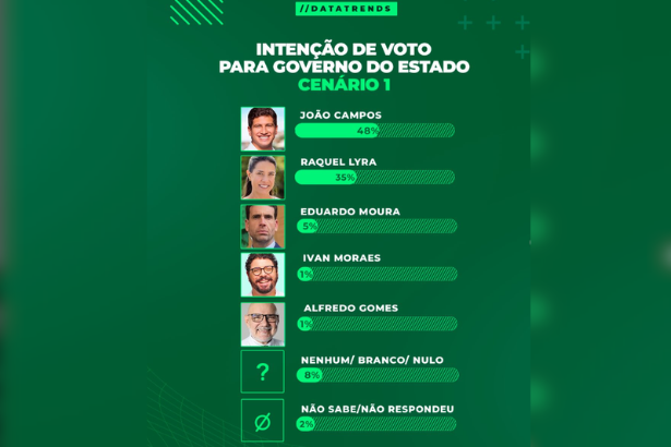 Já em uma projeção para segundo turno, João Campos tem 51% das intenções de voto, enquanto Raquel Lyra alcança 40%. Brancos e nulos totalizam 8%, e 1% dos eleitores não sabem ou preferiram não responder.