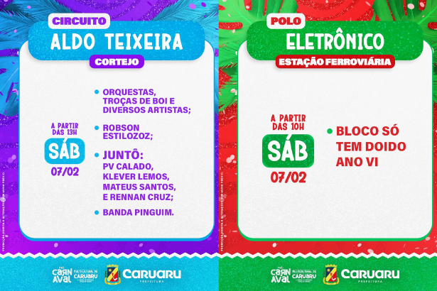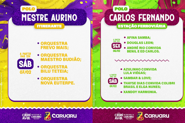 “O Carnaval de Pernambuco começa em Caruaru. Uma grade de mais de 90% dos artistas caruaruenses e a grande atração desse ano, muito pedida nas redes sociais e a gente vai ter essa satisfação de trazer pra cá, no sábado (7), Xanddy Harmonia”, comemorou o prefeito Rodrigo Pinheiro.